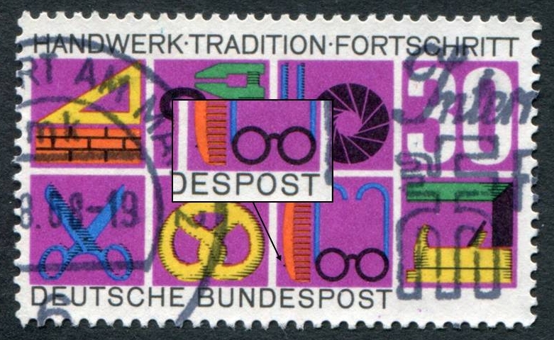 heute geht es um MiNr 553, von der es mehrere offizielle Plattenfehler, aber auch reichlich kleinere Druckabweichungen gibt, wie man in "Pospi's Welt" sehen kann. Dort ist auch ein schwarzer Punkt im Kamm registriert. Heute zeige ich einen scharzen Punkt am Kamm (vielleicht ist der Punkt ja nicht hinreichend ortsfest):