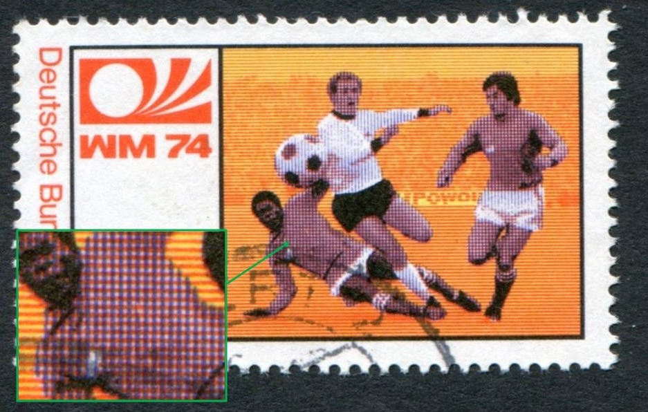 ich bin nun bei der MiNr 812 angelangt, die zur WM 1974 erschienen ist. Da ist mir ein Bruch in der Schraffur am Bein des mittleren Spielers aufgefallen: ...
