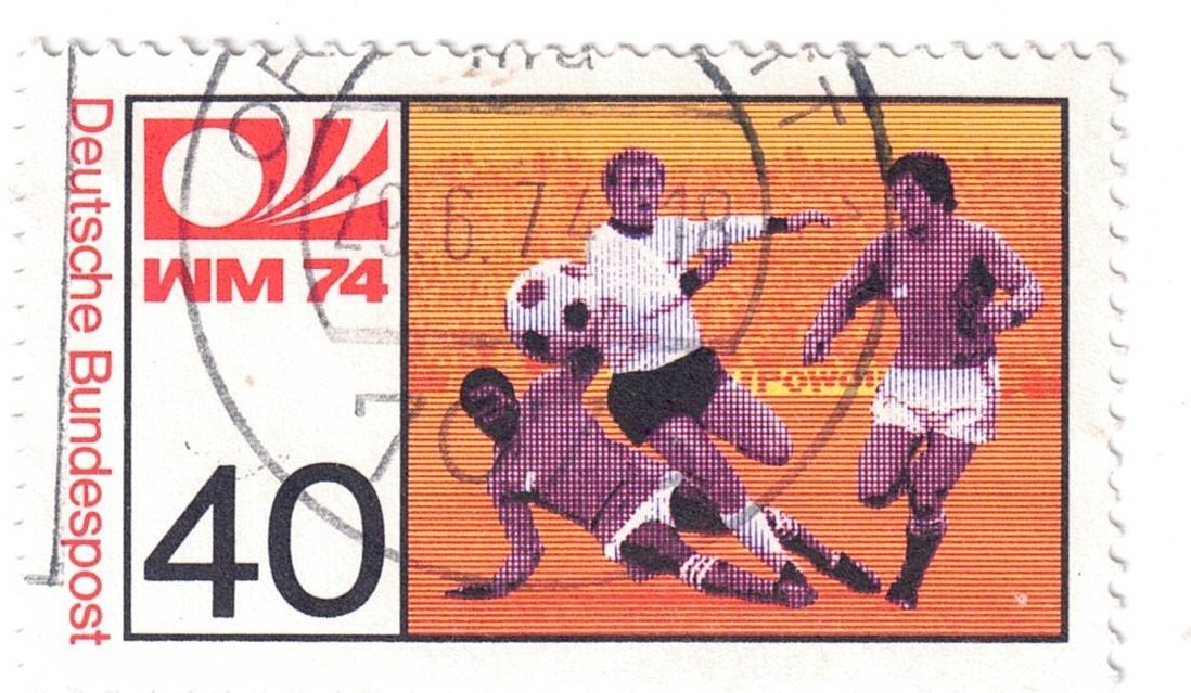 ich bin nun bei der MiNr 812 angelangt, die zur WM 1974 erschienen ist. Da ist mir ein Bruch in der Schraffur am Bein des mittleren Spielers aufgefallen: ...