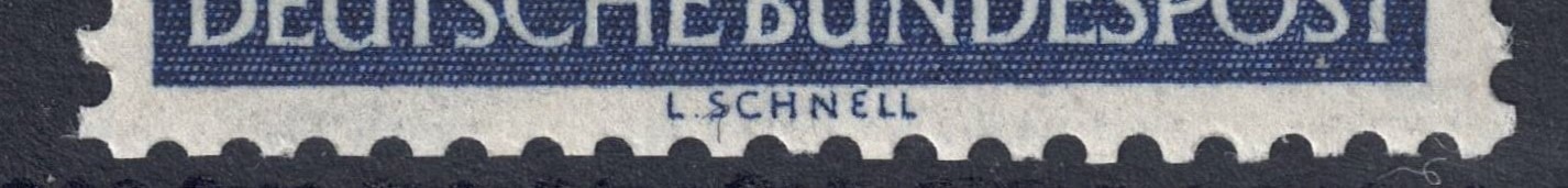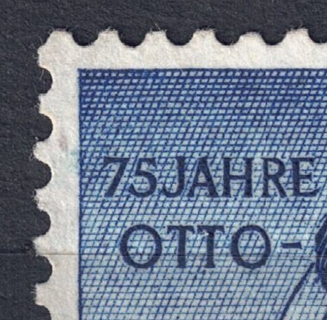 Trotz Abschlag eigentlich gut erkennbar: Die äußere Umfassungslinie O von Post ist rechts unten ab der Waagerechten, auf gut 1/8 nicht vorhanden. Blau im Weiß und keine Abgrenzung zu den weißen Rasterfeldern. Blaue / weiße Beulen.