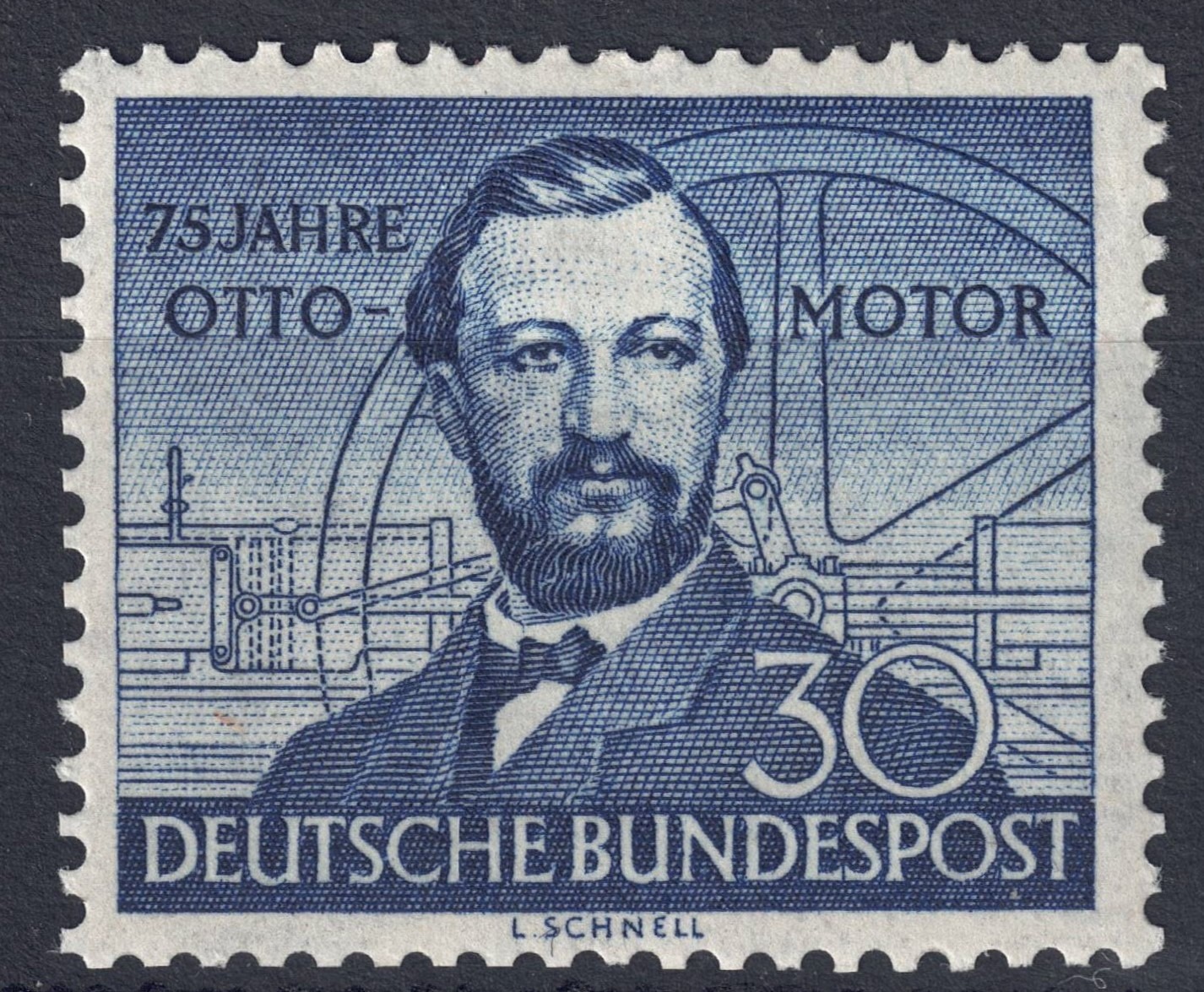 Die vor gezeigte Marke dieser Nummer halte ich für ein schönes Vergleichsbespiel für die angestrebte (mehrfache) untere Flucht der blau gehaltenen Schriftzüge 75 JAHRE OTTO - MOTOR.