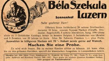 hier eine Werbekarte des schweizer Briefmarkenhändlers Béla Sekula an einen dänischen Markenhändler aus dem Jahr 1922.