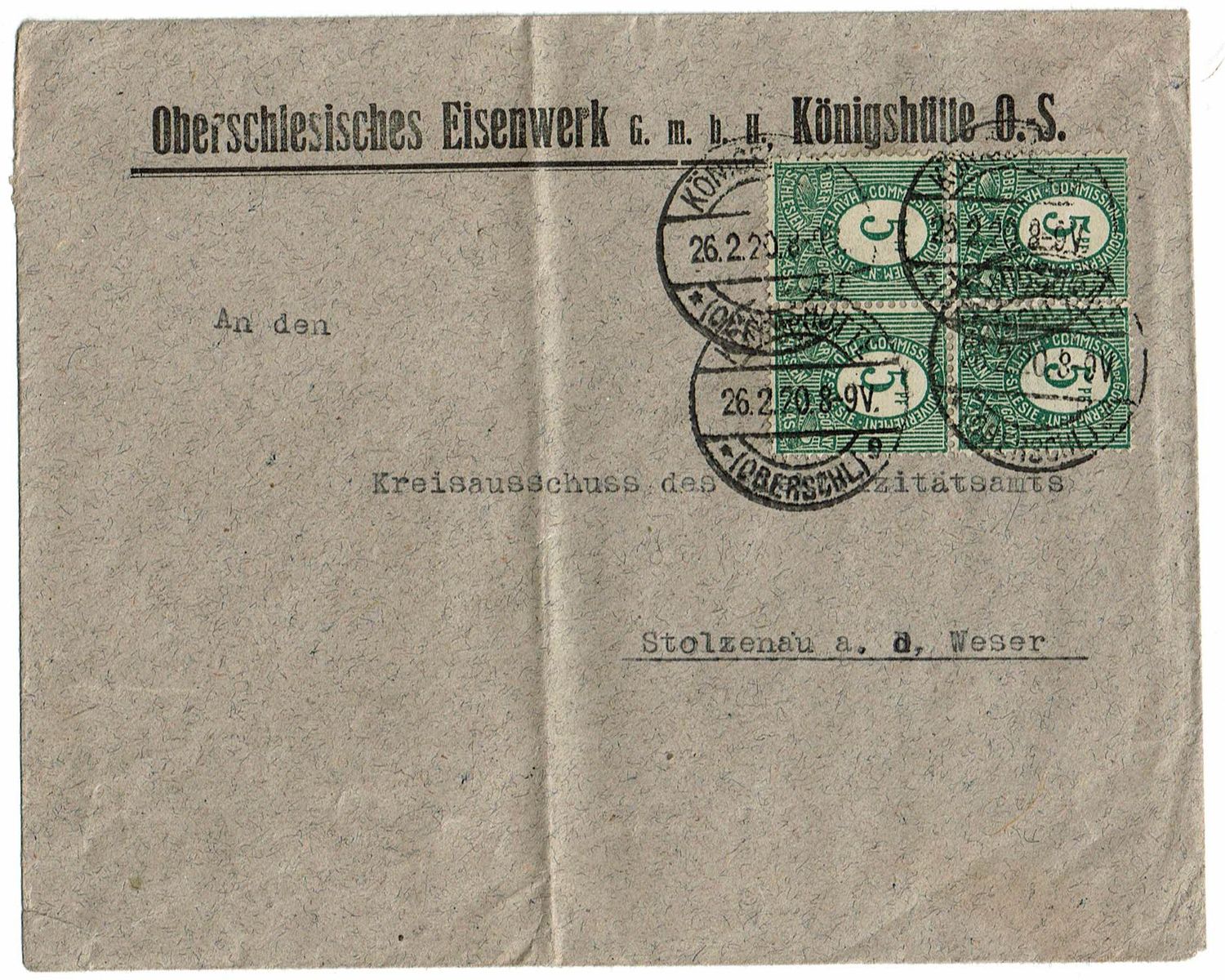 Oberschlesien 4er Block auf Brief (Königshütte)