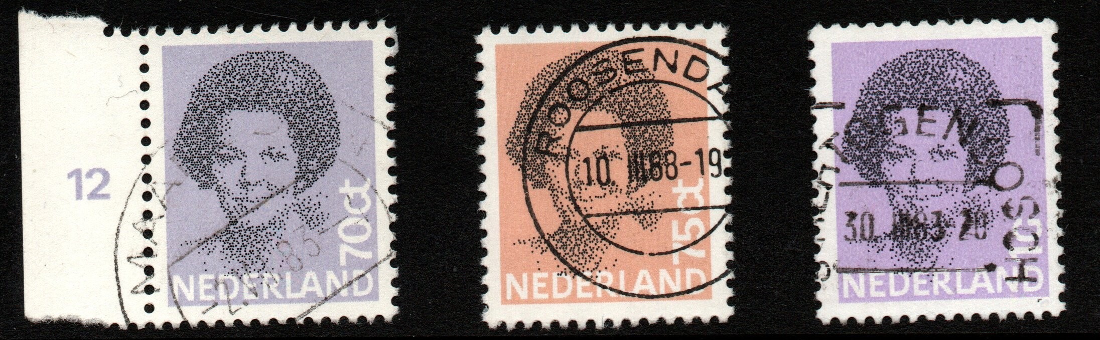 Die 70ct Marke mit etwas undeutlichem Maastricht-Stempel dafür vom Seitenrand mit Bogenranddruck. Die 75ct mit schönem Roosendahl-Stempel und die 1G mit einer anderen Stempeltype von Hertogenbosch.