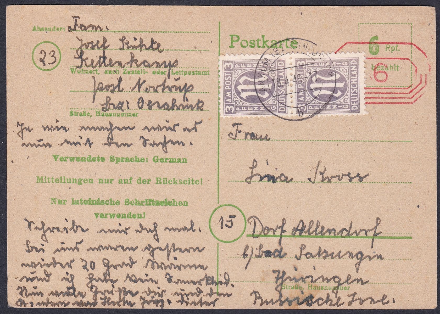 Anbei zeige ich einen neuen Fund meiner Sammlung. M.E. handelt es sich um eine Ganzsache P783 II mit Zusatzfrankatur durch 2 x Michel 17a. Die Fernpostkarte ist von Ankum BZ. Osnabrück nach Dorf Allendorf versandt worden. Abgeschlagen wurde die Postkarte am 18.4.1946. Was mich irritiert ist der Maschinenstempel im Wert von 6 Pf.. Vielleicht hat ein Experte aus dem Forum eine Erklärung dafür. Schon jetzt herzlichen Dank fü jeden Hinweis.