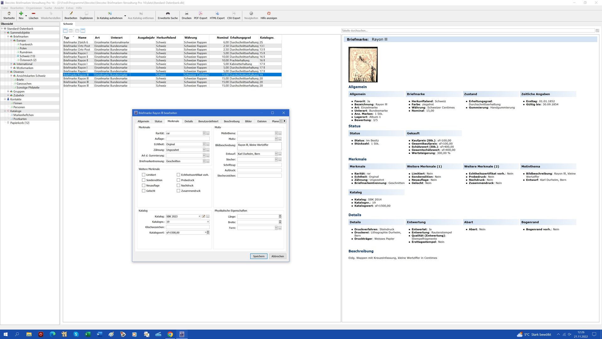 Ich benutze dieses Programm schon seit ein paar Jahren und bin damit sehr zufrieden. Du kannst deine Sammlung archivieren oder auch Fehllisten erstellen. Du kannst auch die vorgegebenen Ordner löschen und durch solche ersetzen die du wirklich brauchst. Die Anzahl Informationen zur Beschreibung einer Marke sind schier unerschöpflich. Das investierte Geld hat mich noch keine Minute bereut. Ich habe unten mal einen Screenshot angehängt, wie es z.T. bei meinen Marken aussieht.