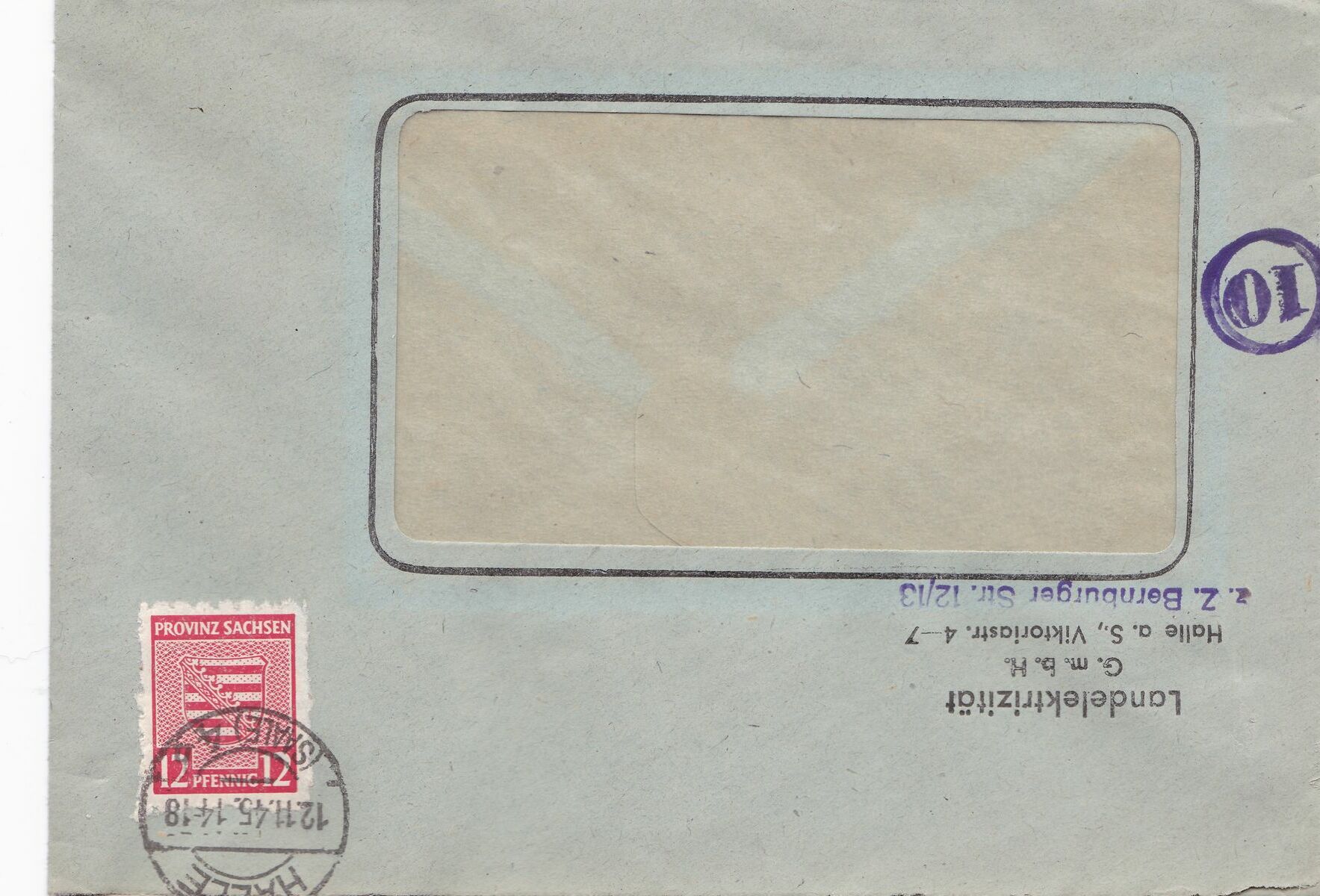 Der zweite Beleg ist ebenfalls mit einer Mi 71 frankiert. Er ist in Halle am 12.11.1945 abgeschlagen worden. Auch hier handelt es sich um einen Fensterumschlag.