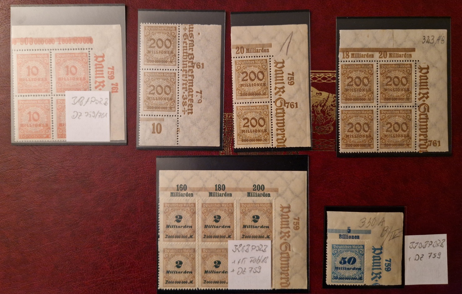 Bei den Kat.-Nummern 318 AP OR B (Reihe 1), 323 APa (Reihe 1, 2, 9, 10), 326 BP OR B (Reihe 1), 330 BP OR B (Reihe 1) kommen am rechten Rand die Nummern 759/761 in wechselnder Position vor. Sind diese Nummer Druckerzeichen oder etwas anderes? DZs kenne ich sonst nur am linken oder unterem Rand.
