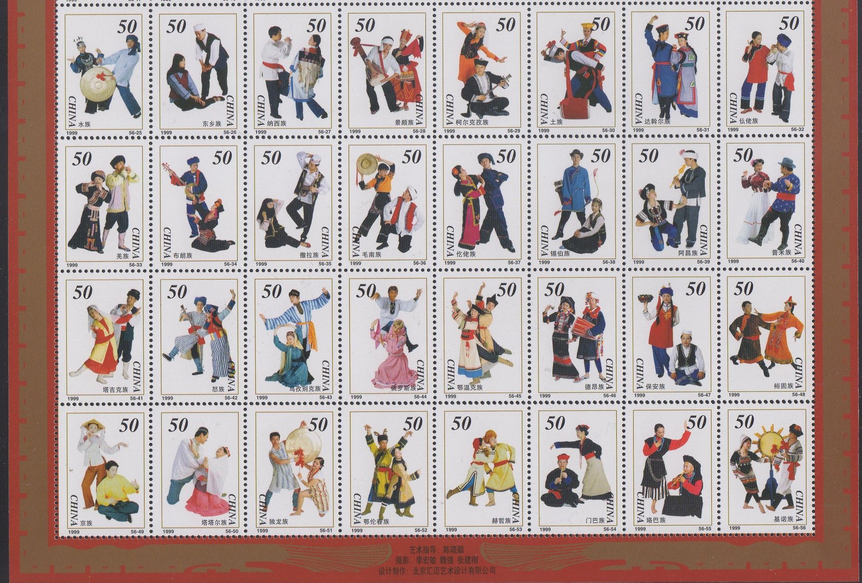 Im Katalog findet man nur einen ähnlichen Bogen mit 56 Werten, aber alle mit dem Nennwert 80 Fen, Michel-Nr. 3030-3085 von 1999, 50 Jahre Volksrepublik China, Ethnische Gruppen.