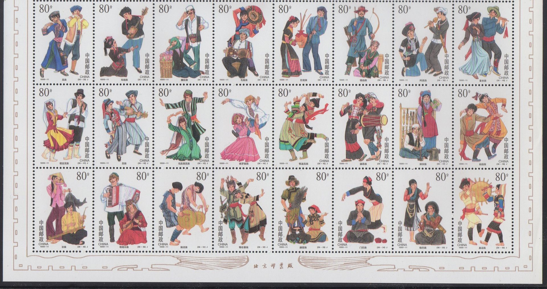 Der 80 Fen Bogen hat, wie es üblich ist, nach der Jahresangabe die Nummer der Ausgabe (1999-11), sodann die Nummer des Bogens mit der Nummer der Marke (56-1 bis 56-56). Ausserdem die Landesangabe CHINA in lateinischer und chinesischer Schrift.
