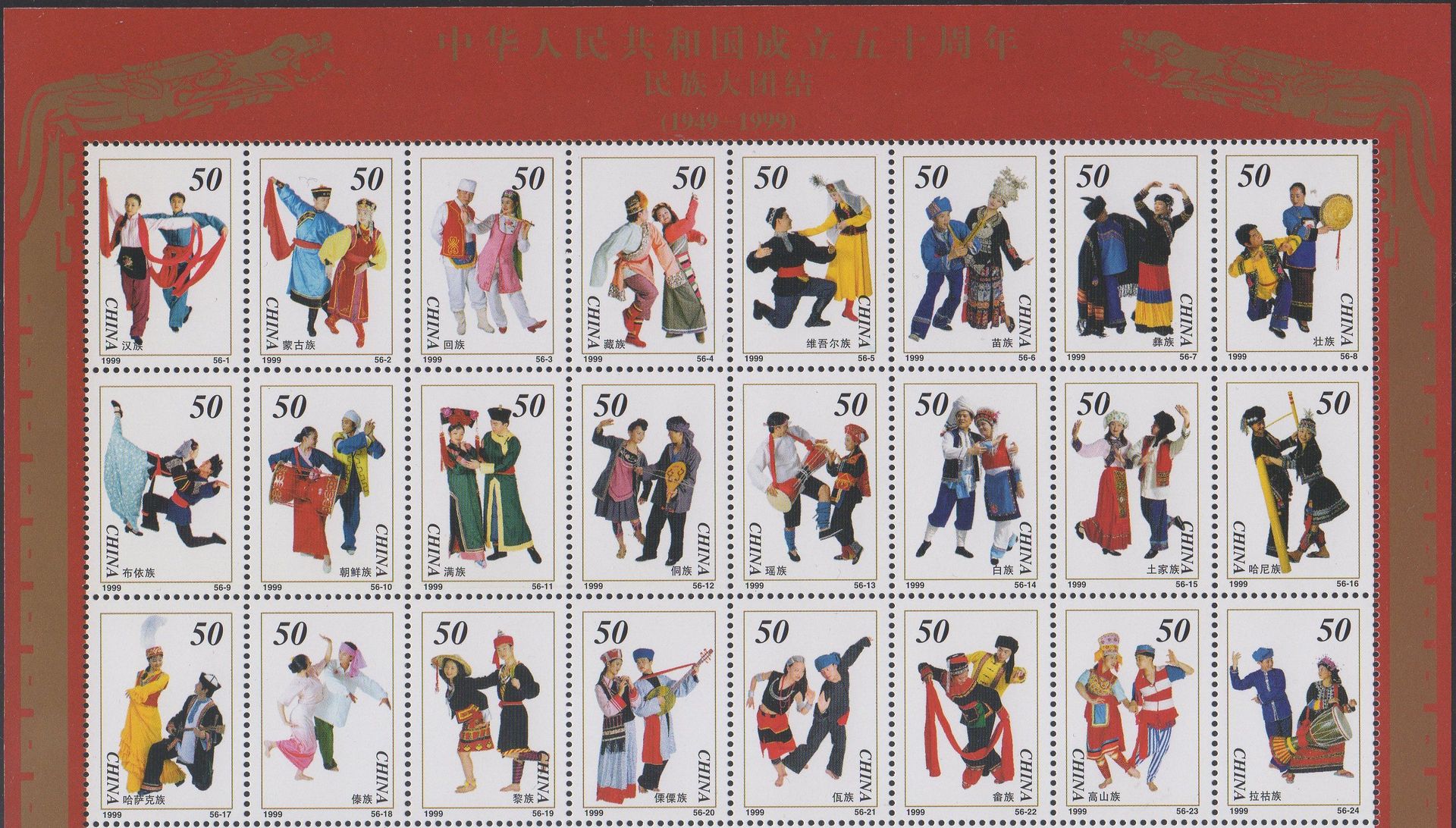 Im Katalog findet man nur einen ähnlichen Bogen mit 56 Werten, aber alle mit dem Nennwert 80 Fen, Michel-Nr. 3030-3085 von 1999, 50 Jahre Volksrepublik China, Ethnische Gruppen.