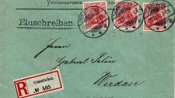 zu guter Letzt noch eine eingeschriebene Postkarte mit Nachnahme aus Lengerich nach Aalborg in Dänemark aus dem Jahr 1911. Nachnahmesendungen ins Ausland waren eingeschrieben zu versenden, die Nachnahmegebühr wurden vom einzuziehenden Betrag abgezogen, Hier also 10 Pfg. Auslandspostkartenporto und 20 Pfg. Einschreibegebühr, ein Paar und eine Einzelmarke der 10 Pfg. Germania. Die Marke unten links hat der Scanner angeschnitten.