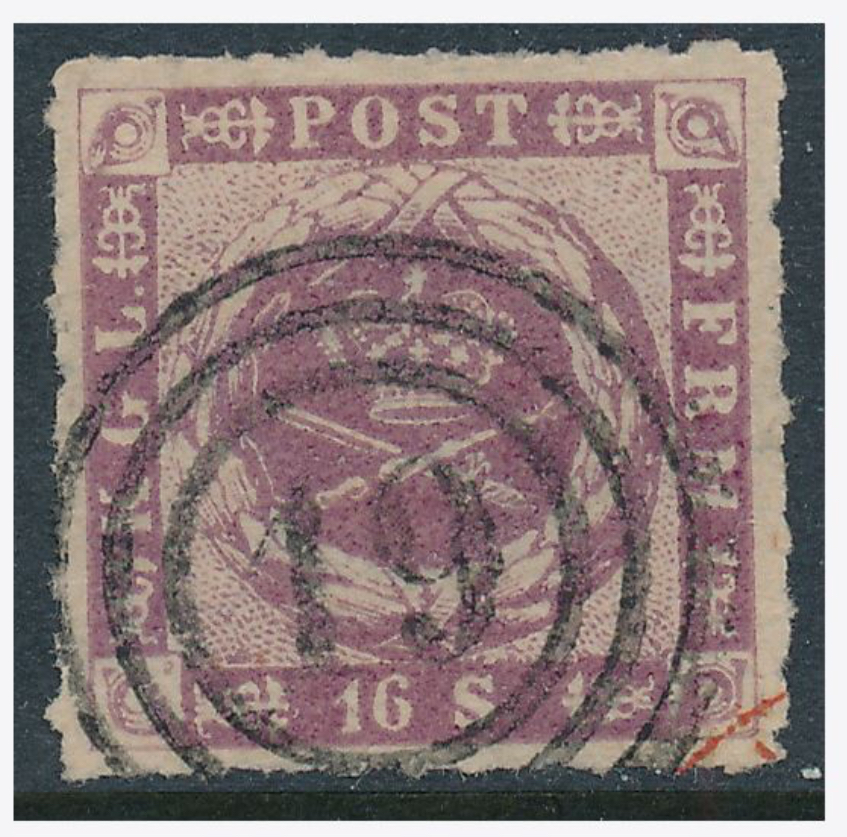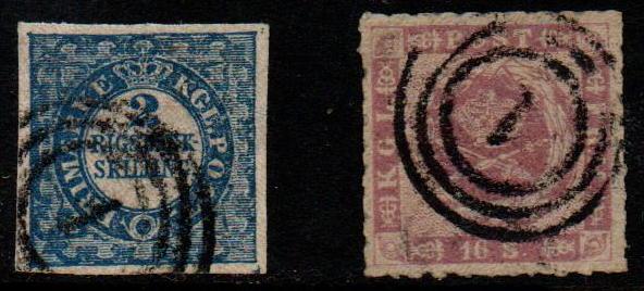 gar nicht so selten aber relativ teuer sind die 2 RBS Marke (hier Thiele-Druck) und die 16 Sk Marke aus dem Jahr 1863, beide sind mit dem Nummernstempel 1, Kopenhagen, abgestempelt.