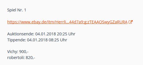 Tipp der Spielleitung: Bitte zügig tippen - Auktion vorab einschätzen, dann entschlossen den Vortipperbeitrag kopieren, den eigenen Tipp ergänzen und unmittelbar abspeichern. Kontrolle der Vorpostings. Das hilft Doppelposts und Überschneidungen zu vermeiden. Das gilt vor allem zum Ende der Tippzeit.