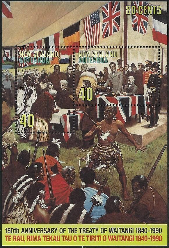 Ein Block zum Frieden von Waitangi erschien am 17.1.1990 mit beiden Landesbezeichnungen. Die Marken, die danach folgten, hatten immer nur noch eine Landesbezeichnung (1990-1991). Auch 1989 und früher konnte ich keine 2 Länderbezeichnungen mehr entdecken. Vielleicht war das die erste Ausgabe?