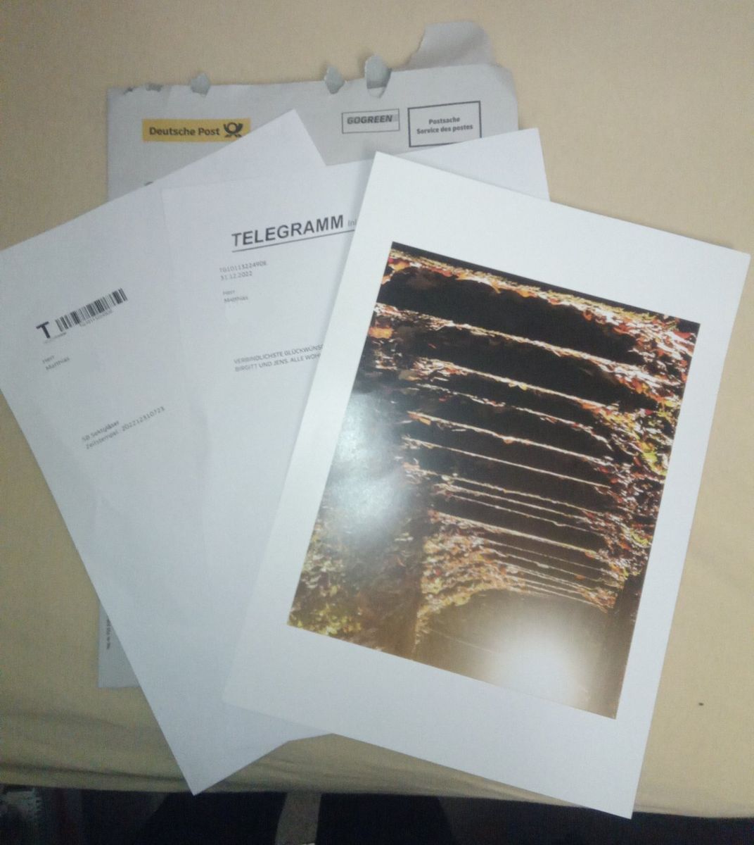 Ich habe - zu meiner Überraschung - ein Telegramm von meiner Tochter bekommen. Sie hat davon gelesen und wollte mir eine Freude machen. Das ist ihr auch vortrefflich gelungen. Das Telegramm lag am letzten Tag des Jahres im Briefkasten. Geklingelt hat niemand ...