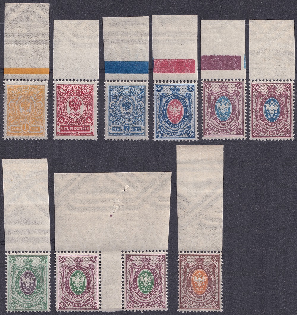 führt. Die Lage der Wasserzeichen, rechts und keines links, links und keines rechts, auf allen Seiten kein Wasserzeichen lässt den Schluss zu, das diese Bögen auf eine zumindest dreibahnigen oder vierbahnigen Druckpresse gedruckt wurden. Die Lage der Aufnadelungen in den Mittenbereichen der Druckbögen, die Art der Kontrollstreifen und die Bogensignaturen deuten einwandfrei auf den Druck mit einer Zylinderschnellpresse wie sie z.B. König und Bauer nach St,Petersburg in grosser Stückzahl geliefert haben. Die unbedruckten Druckbögen wurden mittels eines Bogengreifers vom Auflagentisch dem Zylinder zugeführt und von auf dem Zylinder befindlichen Nadeln arretiert und dem waagerecht ausgeführten Druckfundament zugeführt. Die variable Einfärbung durch horizontale Beweglichkeit der Farbwerkwalzen, Hoch- und/oder Tiefstellung, deuten auf die Bogenmerkmale der zweiten Auflage hinund so in keinem anderen Druckpressentyp zu finden. Aus der Zurichtung und der Einrichtung ergeben sich für die jeweiligen Phasen weitere Hinweise auf Andruck und Fortdruckproben.Die Unterteilung in Erstauflage und Nachauflage ist wirklichkeitsfremd. Aufgrund des zeitlichen Rahmens (zB.1909-1911) muss davon ausgegangen werden, dass es nur einer Auflage gab, welche auf verschiedenen Druckpressen gedruckt wurden. Was dann in der Zeit mit der Auflage ab 1915 geschehen ist, will ich im nächsten Beitrag berichten.