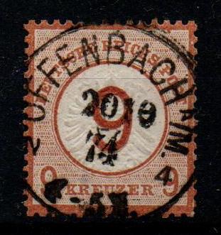 auch die 9 Kreuzer Marke mit großem Brustschild kam am 1. Januar 1874 mit einem Buchdruckaufdruck des Nominalwerts im Medaillon heraus. Über die Beweggründe hatte ich ja schon bei der 2 1/2 Groschen Marke, Mi. Nr. 29, geschrieben.