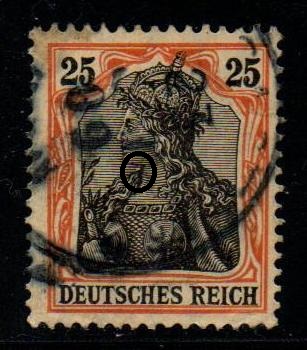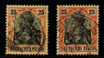 Die Germaniamarken ab der Wertstufe 25 Pfg. wurden auf farbigem Papier gedruckt. Der Michel-Spezial nennt folgende Farbfamilie: dunkel- bis schwärzlich(rötlich)orange/gelbschwarz auf hellgelbem Papier. Germaniafan bezeichnet die Farbe als dunkelorange/gelbschwarz auf hellgelbem Papier.