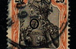 Bei den Druckabweichungen zeigt Germaniafan nur einige wenige Beispiele, alles unscheinbare weiße Flecken im schwarz gedruckten Bereich (Wertziffern, Schriftzug und Mittelstück).