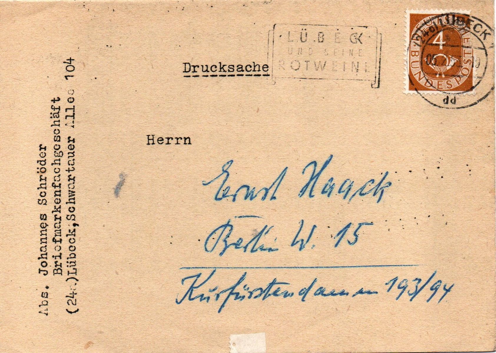 auch wenn die 4 Pfg. Posthorn-Marke beschädigt ist, an diesem Maschinenstempel aus Lübeck Mit Werbeeinsatz "LÜBECK / und seine / ROTWEINE" aus dem Jahr 1953 hätte sicherlich auch Bernd HL seine Freude auch wenn es nicht um Marzipan geht.