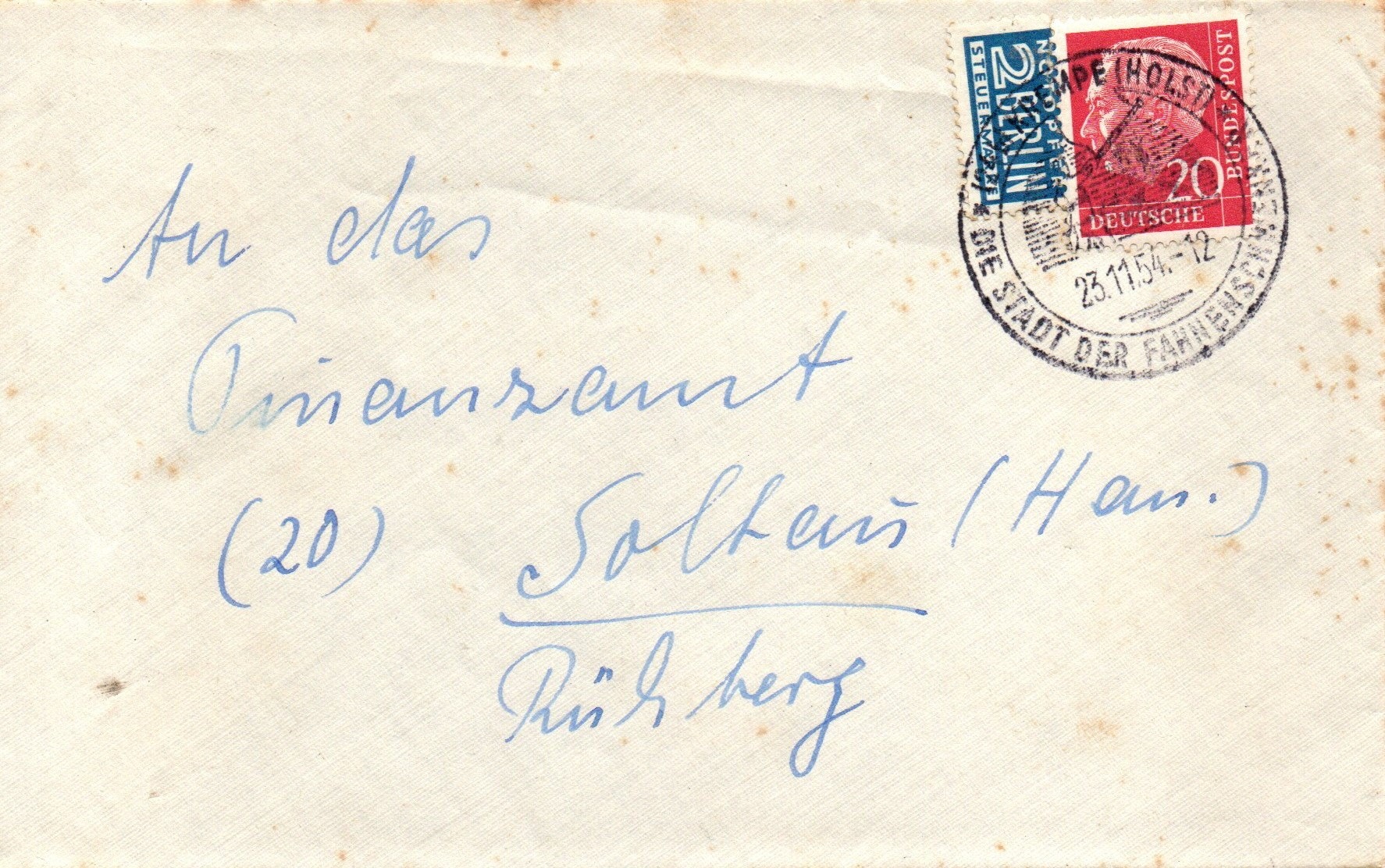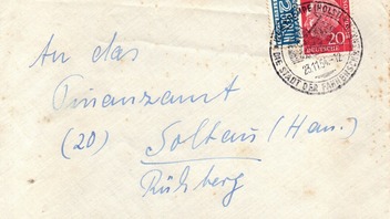 Offenbar hatte der Vorbesitzer den Umschlag aus einer 1€ Grabbelkiste. Ich selbst habe das ganze Konvolut vor ganz vielen Jahren als Heimatbelege-Posten aus Schleswig-Holstein bei Schwanke für kleines Geld ersteigert.