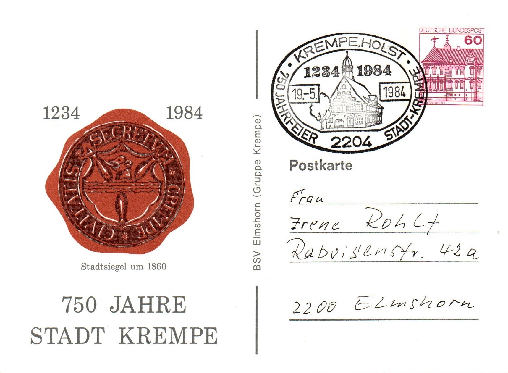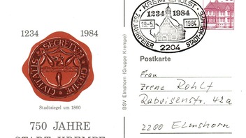 Sonderstempel anläßlich der 750 Jahr Feier der Stadt Krempe auf entsprechender Privat-Ganzsachenpostkarte des BSV Elmshorn.