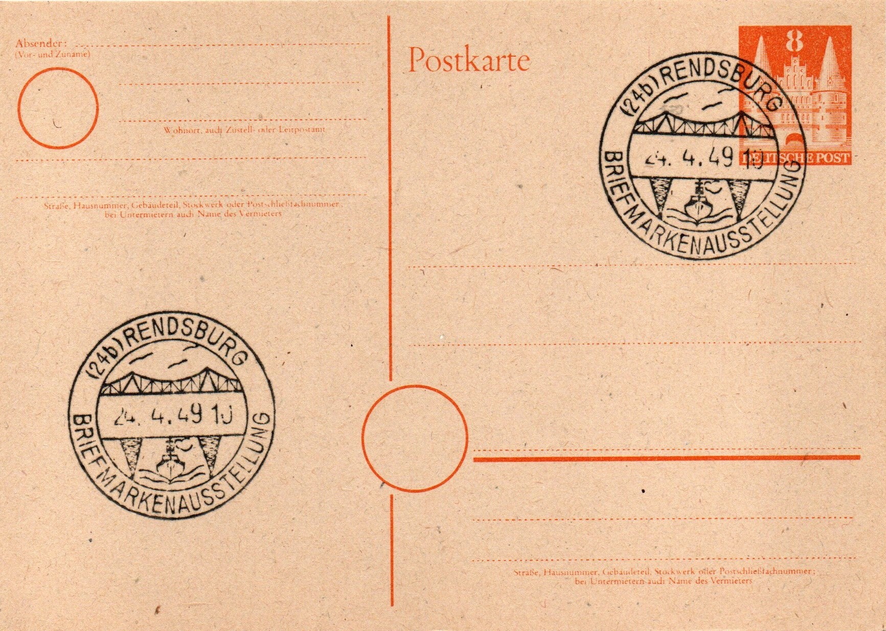 Eine 8 Pfg. Bauten-Ganzsachenpostkarte (Mi. P1) mit dem Zweikreisstegstempel "(24b) Rendsburg Briefmarkenausstellung 24.4.49 10"