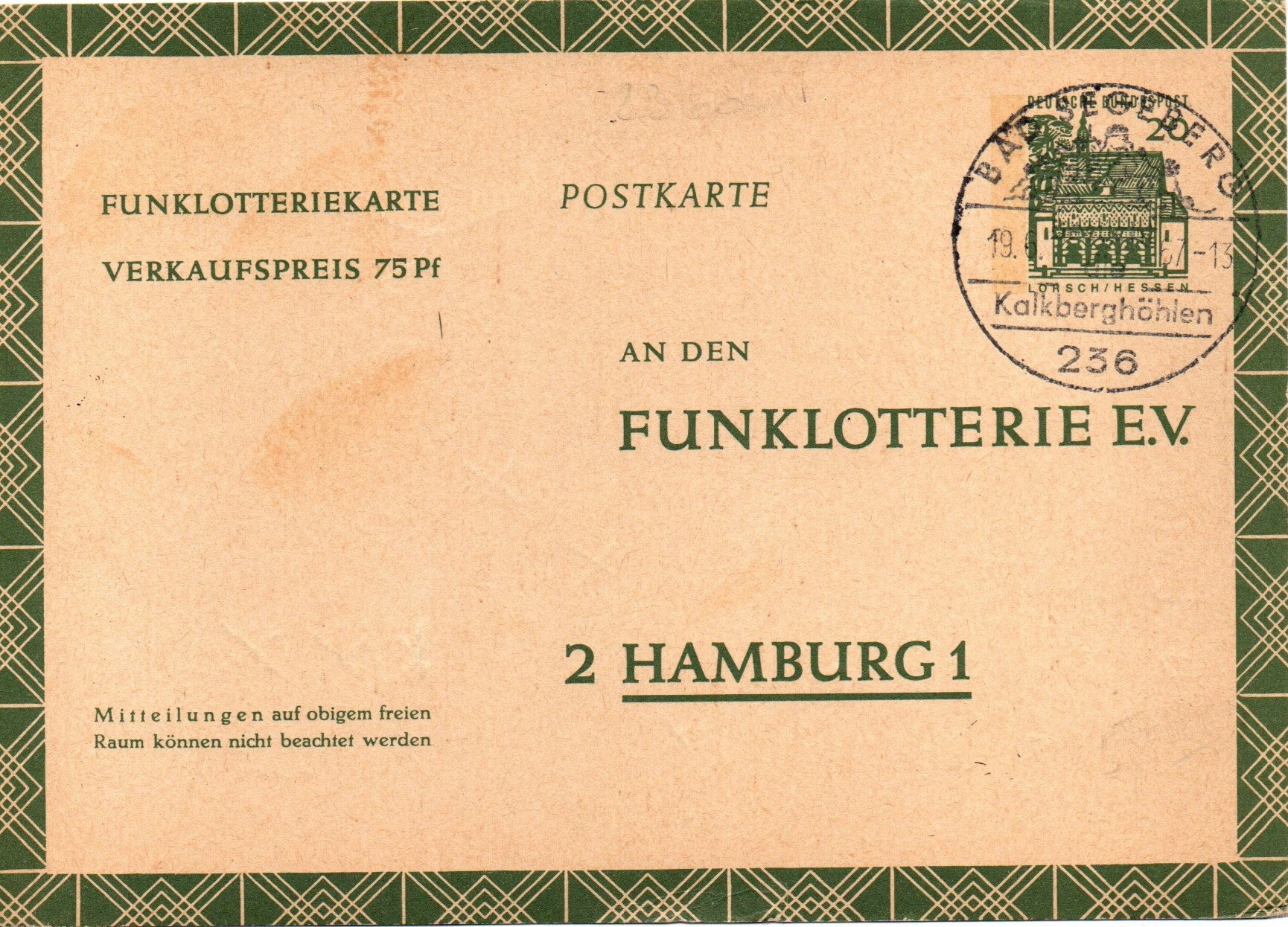 diesmal zeige ich den Werbestempel "236 Bad Segeberg / Kalkberghöhlen 19.6.67 - 13" auf einer 20 Pfg Funklotteriekarte (Mi. FP12). Die Funklotterie war eine Rundfunksendung des NDR von 1948 bis 1969. Also einer Zeit als das Fernsehen noch nicht so verbreitet war.