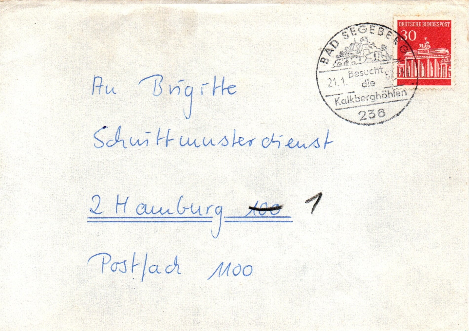 ein zweiter Beleg mit dem zuletzt gezeigten Werbestempel aus Bad Segeberg zeigt, dass meine Stempelbeschreibung im vorigen Beitrag unvollständig war. Ein Teil des Textes ging vor dem Hintergrund des Markenbildes unter.