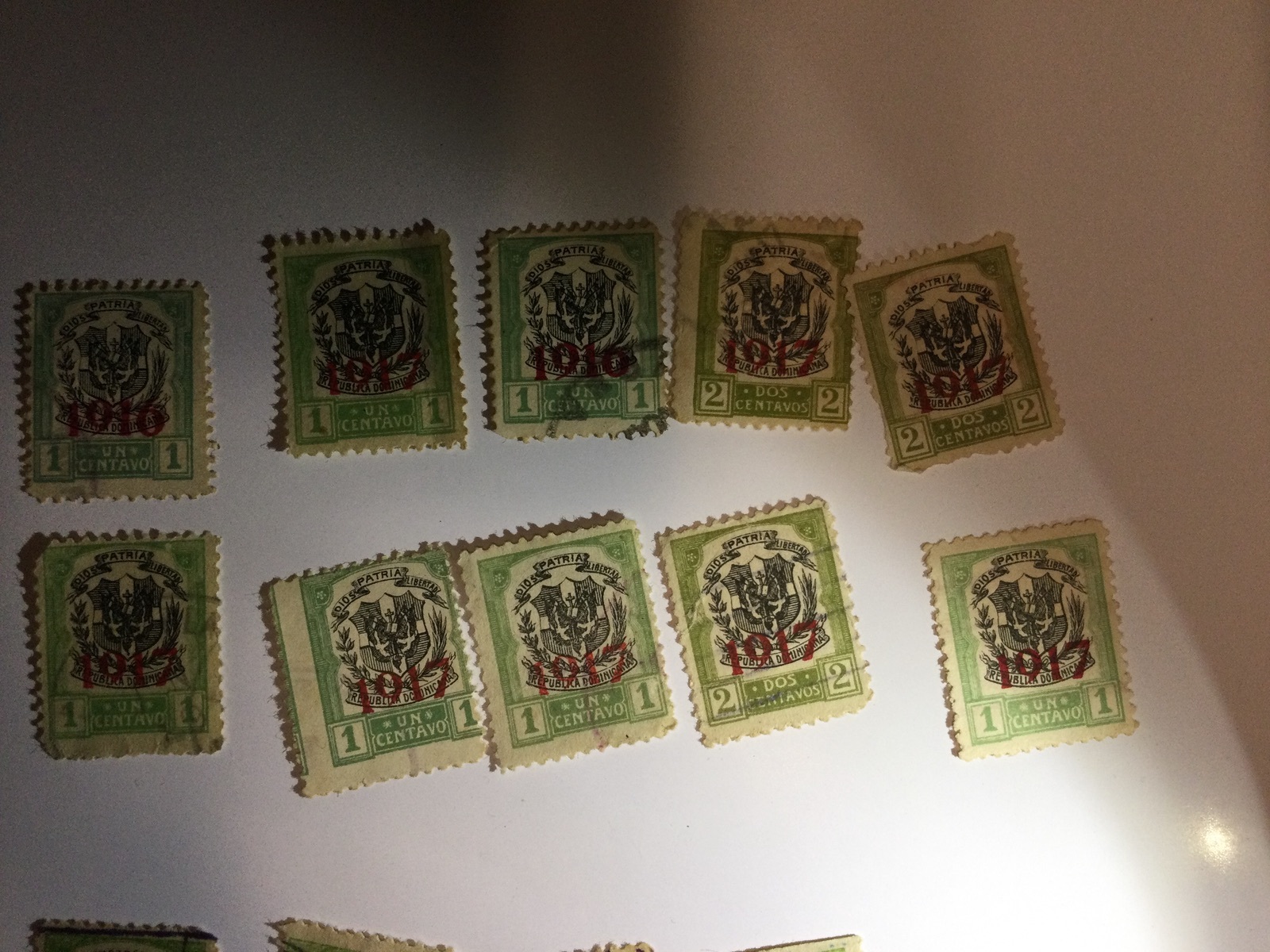 Das sind Marken der Dominikanischen Republik (nicht Dominica!), Wappenausgabe mit Überdruck Jahreszahlen. Im Katalog findet man sie zwischen den Michel-Nummern 179 und 195. Die niedrigen Nominalwerte sind in meinem Uralt-Katalog nur Pfennige wert. Aktuelle Preise kann noch jemand anderes nennen.
