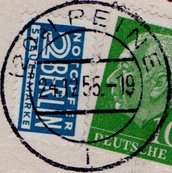 Nachtrag: dem aufmerksamen Leser wird aufgefallen sein, dass sich die Einstzzeiten des "kurzen" und "langen" Typs mit dem UB i überschneiden. Es sind circa 2 Monate wo beide Stempel (wohl nicht an einem Ort) im Einsatz waren. Das ist soweit nicht ungewöhnlich. Dabei herausstechen tut natürlich der bereits gezeigte Abdruck aus dem Jahre 1957. Man könnte an einen Zahlendreher denken, aber es fehlt für den 24.12.1954 die Notopfer Marke.