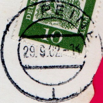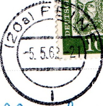 Den Anfang macht der 20a Peine mit UB "i" - die Urform war bis zum 5. Mai 1962 (einem Samstag) im Einsatz. Irgendwann kurz danach wurde das Stempelgerät eingezogen und die "20a" aus dem Stempel getilgt.