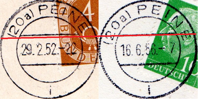 Bevor jetzt jemand schreibt er hätte Dutzende nach diesem Spätdatum - ja die mag es geben, aber mit einem kleinen Unterschied. Aus mir nicht ersichtlichen Gründen hat man in Peine verschiedene Typen eingeführt, was die Größe des Ortsnamens incl Postgebietsleitzahl betrifft.