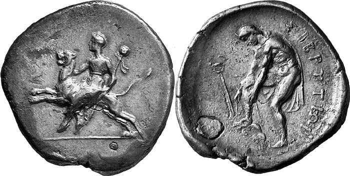 Die 1 Lepta- und die 50 Lepta-Marke zeigen beide einen Stater (eine Silbermünze) der Stadt Sybrita und zwar dessen Rückseite. Abgebildet ist Hermes, der sich seine rechte Sandale schnürt. Es handelt sich wohl um die älteste Abbildung einer Bronzestatue des bedeutenden Bildhauers Lysippos (von der einige schlechtere römische Marmorkopien überlebt haben, so z.B. die im Louvre in Paris).