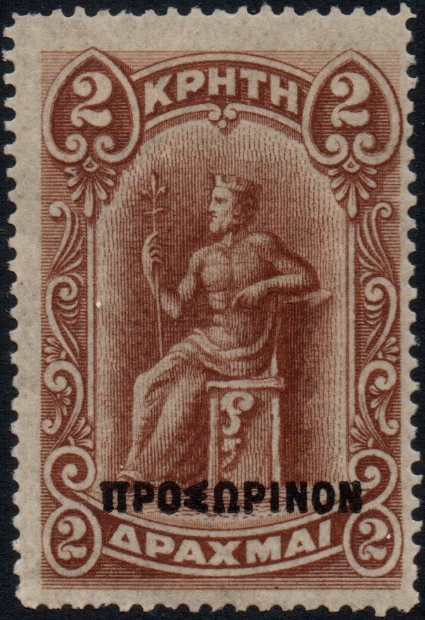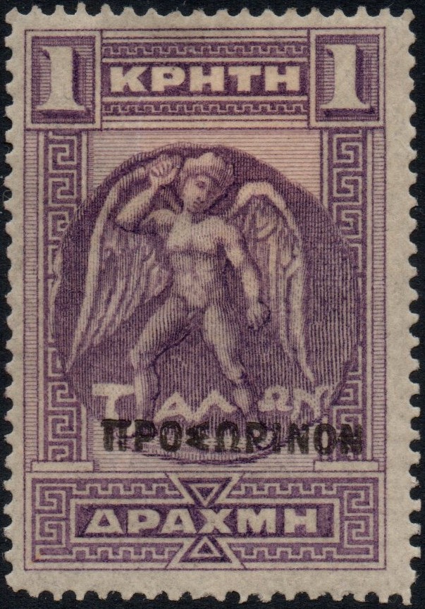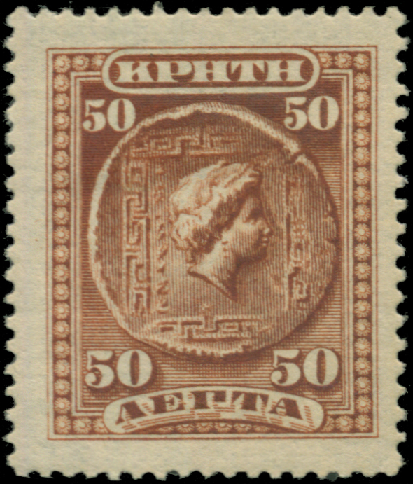 Die ersten mir bekannten Darstellungen von antiken Münzen auf Briefmarken (von Münzen überhaupt) erschienen am 1. März 1900 in der allerersten Briefmarlenserie der noch jungen Republik Kreta. Von den 9 Werten der Serie zeigen 6 Darstellungen von antiken Münzen Kretas (und ein Wert, der 5 Drachmen-Wert, zeigt eine britische Goldmünze).