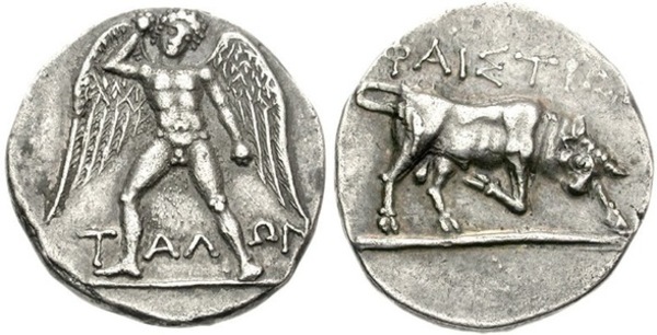 Die 1 Drachme-Marke (Michel Nr. 7) zeigt die Vorderseite eines Staters der Stadt Phaistos, ebenfalls aus der Zeit um 300-270 v.Chr. Sie zeigt den Riesen Talos, der einen Stein schleudert.