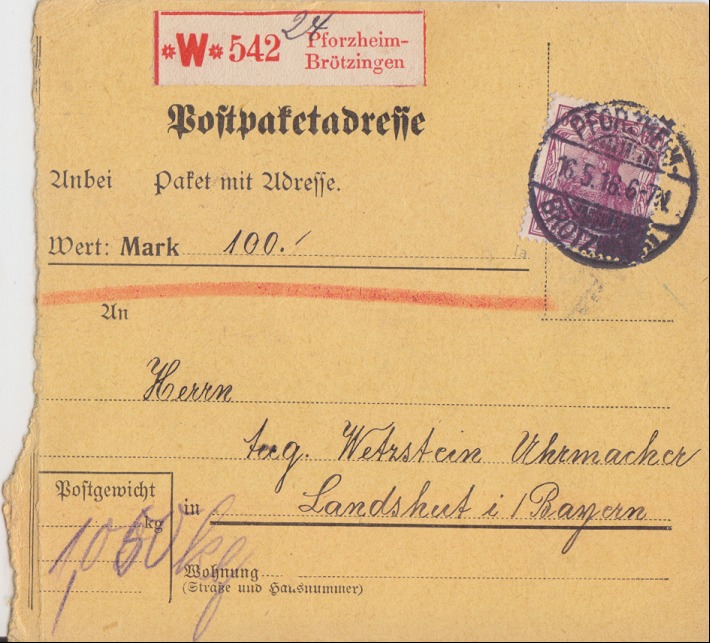 Versendet von Pforzheim-Brötzingen am 16.5.1918 nach Landshut in Bayern.