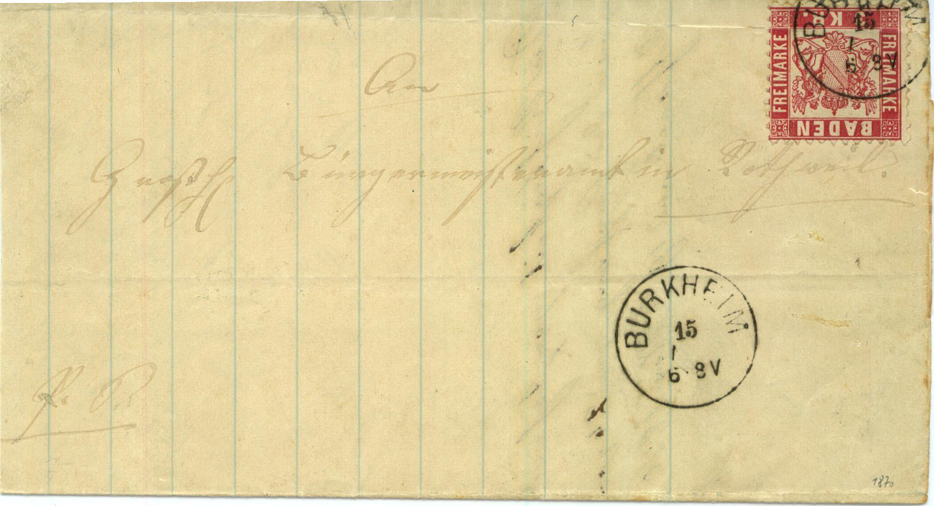Nachstehend ein Dienstbrief nach Eichstetten mit dem Uhrradstempel