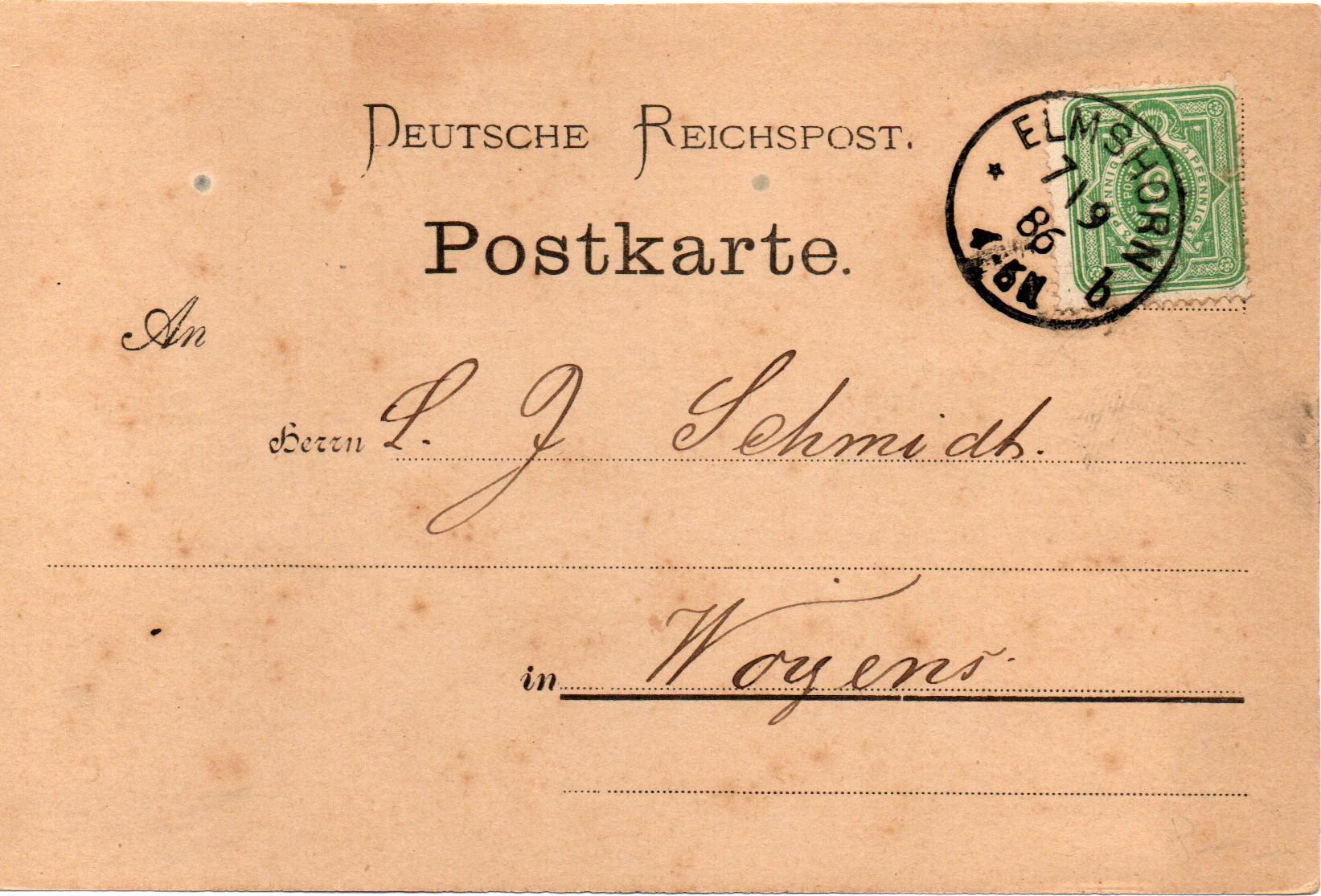 Vertreterpostkarte (nur gedruckter Text) aus Elmshorn nach Woyens (Nordschleswig). Als Drucksache freigemacht und unbeanstandet befördert obwohl der Vermerk "Postkarte" nicht gestrichen wurde,