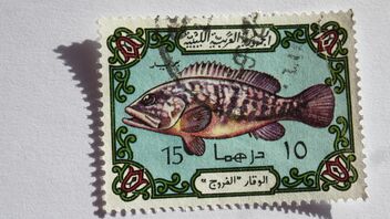Der libysche Fisch ist Michelnummer 444 aus einer von zwei Ausgaben die 1973 und 1975 erschienen und sich nur in den Farben unterscheiden. Wir hatten auch davon schon mal ein Exemplar an der Angel.