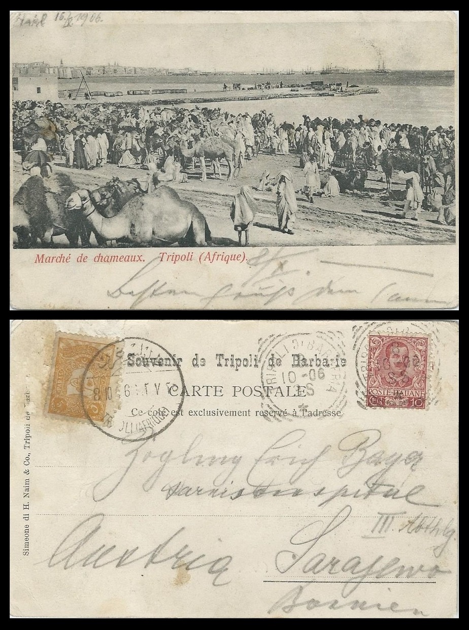 AK gestempelt 8. 10. 1906 Tripolis, frankiert mit türkischer und italienischer Marke. In Tripolis bestand seit 1869 ein Italienisches