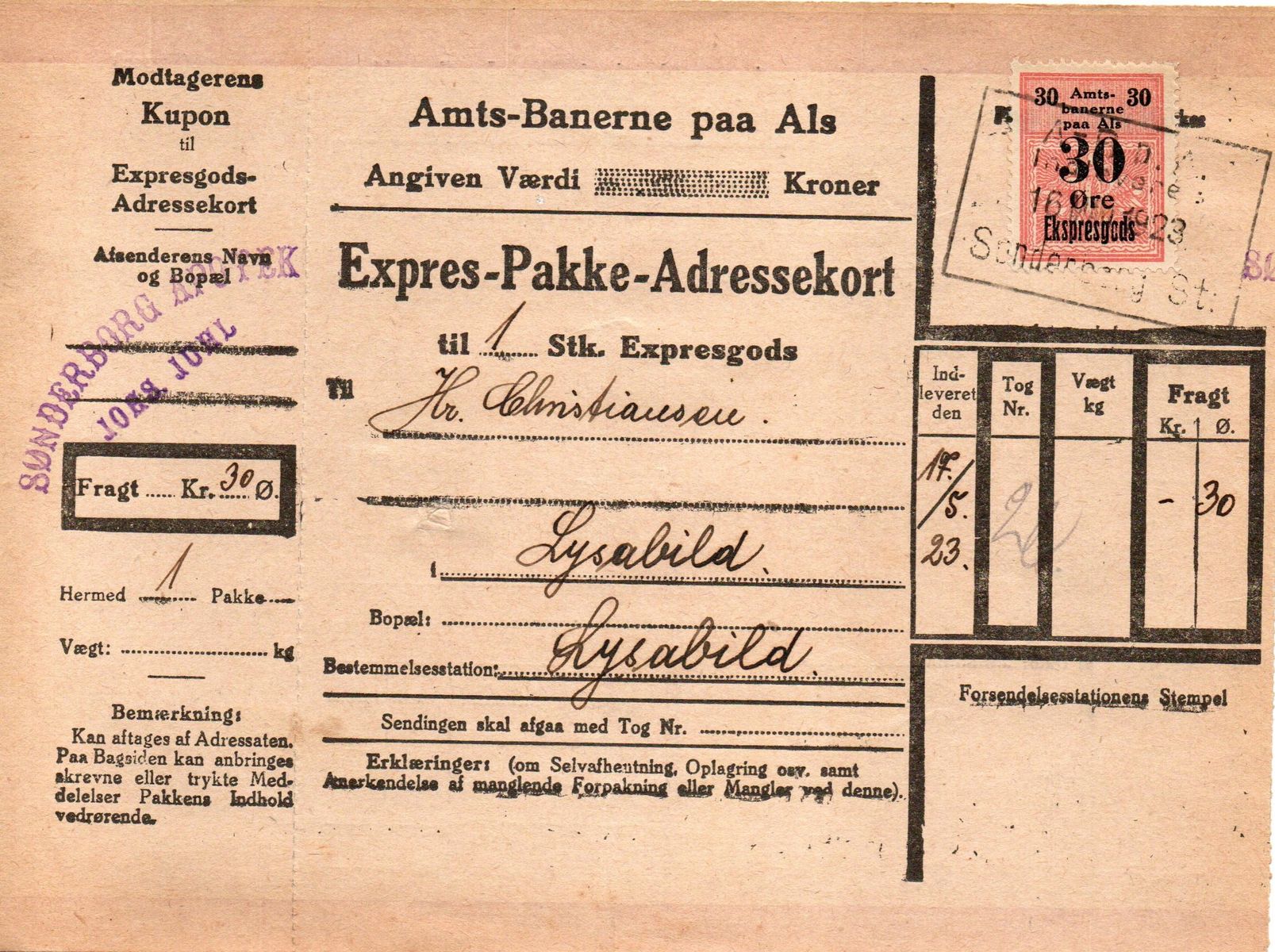 Diese Paketkarte wurde für eine Expressgutsendung von Sonderburg nach Lysabild ausgestellt und war mit einer 20 Öre Marke frankiert. Lysabild ist eine kleine Gemeinde mit Bahnstation an der Strecke Sønderborg - Skovby (deutsch: Schauby)