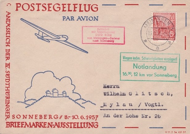 Hier ein ähnlilcher Notlandungs-Postsegelflug von Sonneberg nach Finnland 1957. solche Notlandungen waren wohl damals nicht so selten und bekamen dann einen Sonderstempel: