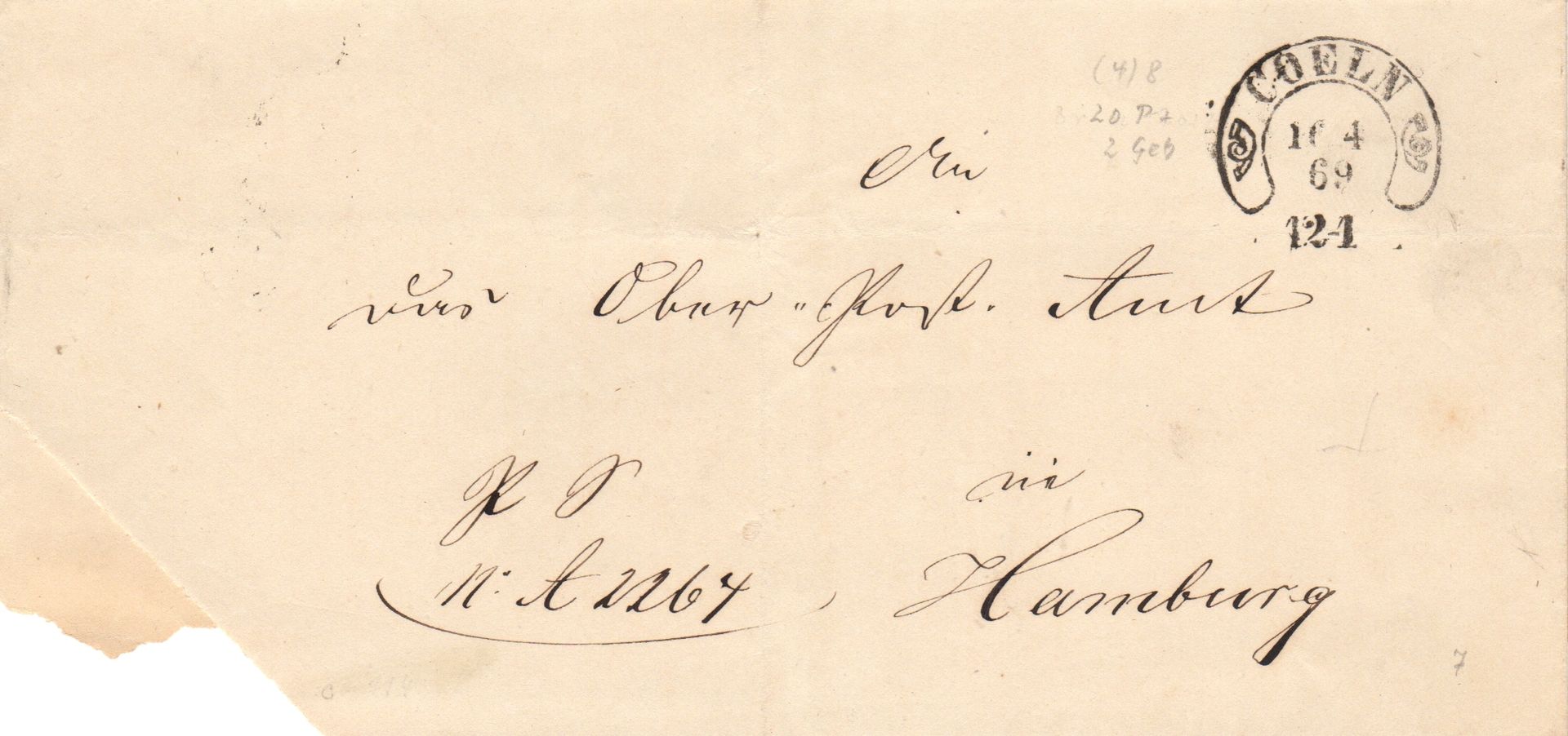 Eigentlich fiel mir dieser Brief wegen seinem sehr klaren Stempelabschlag ins Auge. Da er relativ günstig war, habe ich ihn mitgenommen. Es handelt sich gemäß handschriftlicher Notiz links: d. S./m. A. um eine Dienstsache mit Attest. Der Brief war an die Klosterobrigkeit in Itzehoe gerichtet. Der Kreisstempel "Neumünster 18/9 5-7" lt. Handbucn der ARGE die Nr. 3, bekannte Verwendungsdaten 15.6.1850 bis 14.8.1854.