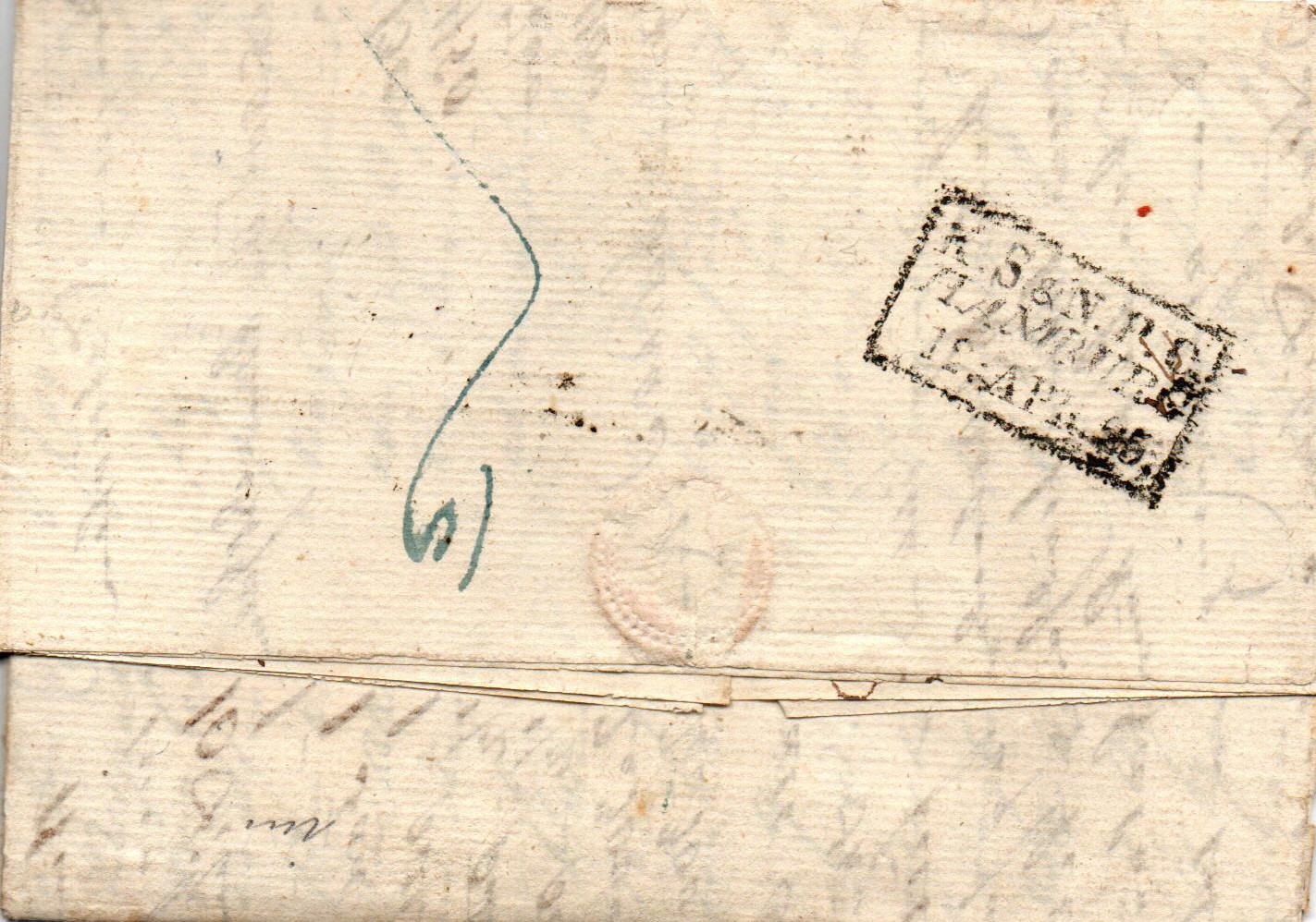 Auch wenn hier keine weiteren Transitstempel vorhanden sind, gehe ich davon aus, dass der Brief via Belgien, Aachen (preuß. Post) nach Hamburg lief und dort der Hamburger Stadtpost übergeben wurde. Denkbar wäre natürlich auch der direkte Weg per Schiff von London nach Hamburg.