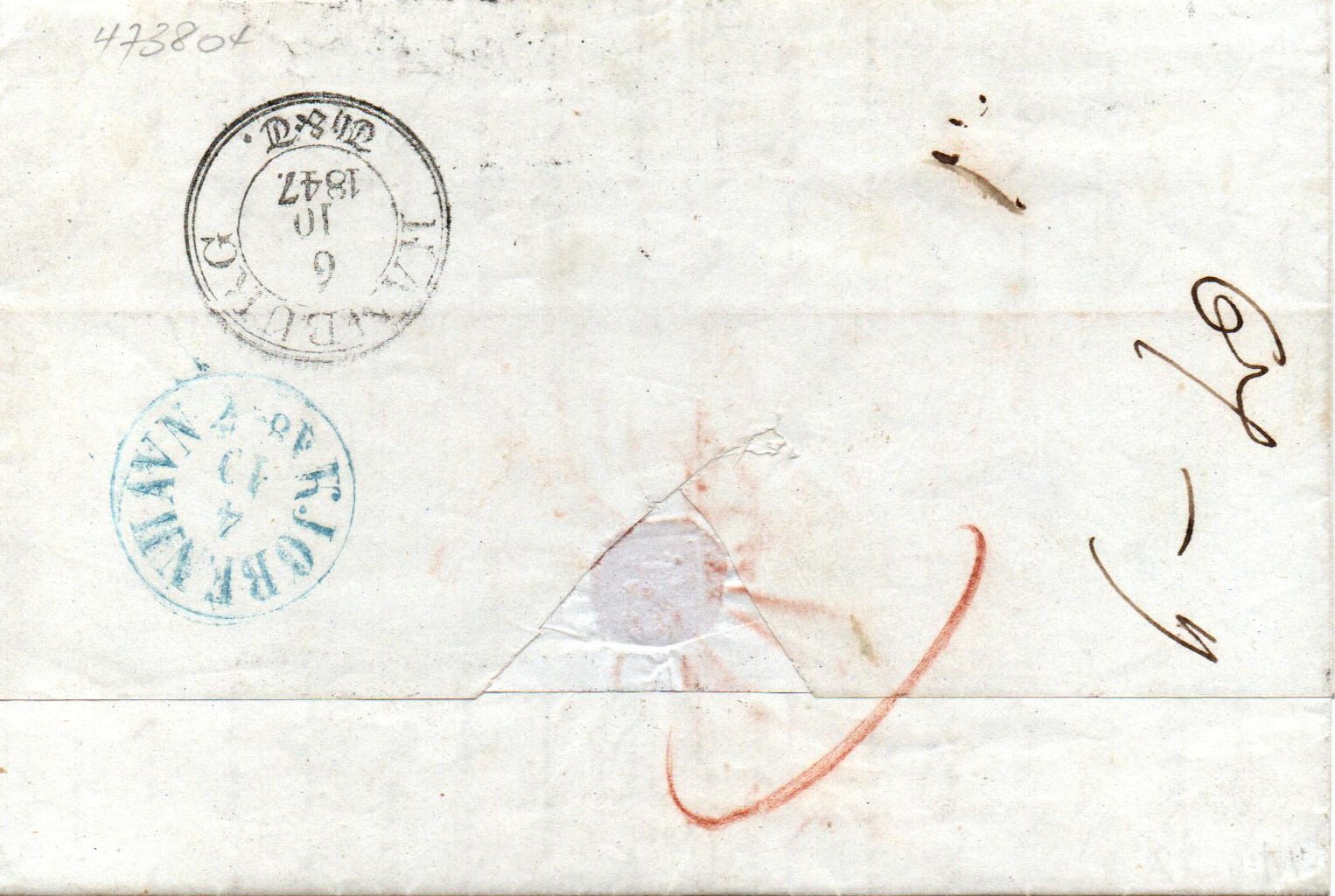 Zudem rückseitig der dänische K1-Stempel (blau) "Kjøbenhavn 4.10.1847" Vorderseitig den handschriftlichen Vermerk "al 24" (vielen Dank an @nodlicht der aus der "Wellenlinie" eine 24 herausgelesen hat) al steht für Auslagen, die 24 sind die Umrechnung der 9 Sch. Crt. in Kreuzer die Th.& T. an die dänische Post zu zahlen hatte. Die Rötel-9 ist nochmals der dänische Portoanteil in Schilling Crt. Der Brief wurde in Hamburg an Thurn & Taxis übergeben, Vorderseitig der L2-Stempel "DANEMARCK / PAR HAMBOURG" und rückseitig der K3-Stempel "HAMBURG TH&T. 6.10.1847" des Th.&T. Postamts in Hamburg.