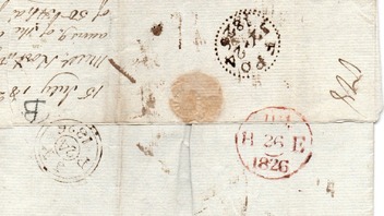 Wie seinerzeit leider üblich keinerlei dänische Poststempel. Als Transitstempel der sogenannte Schmetterlingsstempel des Stadtpostamts Hamburg (ARGE Handbuch Nr. 3, es gab 7 verschiedene Typen) vom 18. Juli 26. Rückseitig einige britische Stempel: Der dotted circle "FPO JY 24, 1826" ist vom Foreign Post Office London (Type 1/39 lt SG Collect British Postmarks). Den Dreikreisstempel "P JY 24 1826" habe ich nicht gefunden, da ebenfalls vom 24. Juli muss er eigentlich auch in London abgeschlagen worden sein. Dann in rot die schott. Stempeltype 4/10 "H E JUL 26 1826" Zudem auf dem Hamburger Stempel undeutlich abgeschlagen der R1-Stempel "1/2" das ist die schottische Mail coach tax.