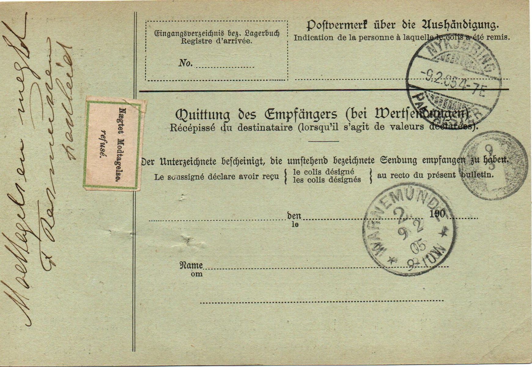 Ich kann hier sowohl eine Paketkarte als auch einen Wertbrief zeigen. Den Auftakt macht, weil Einzelfrankatur, eine mit einer 1 Mark Marke frankierte Paketkarte mit Nachnahme nach Dänemark aus dem Jahr 1905.