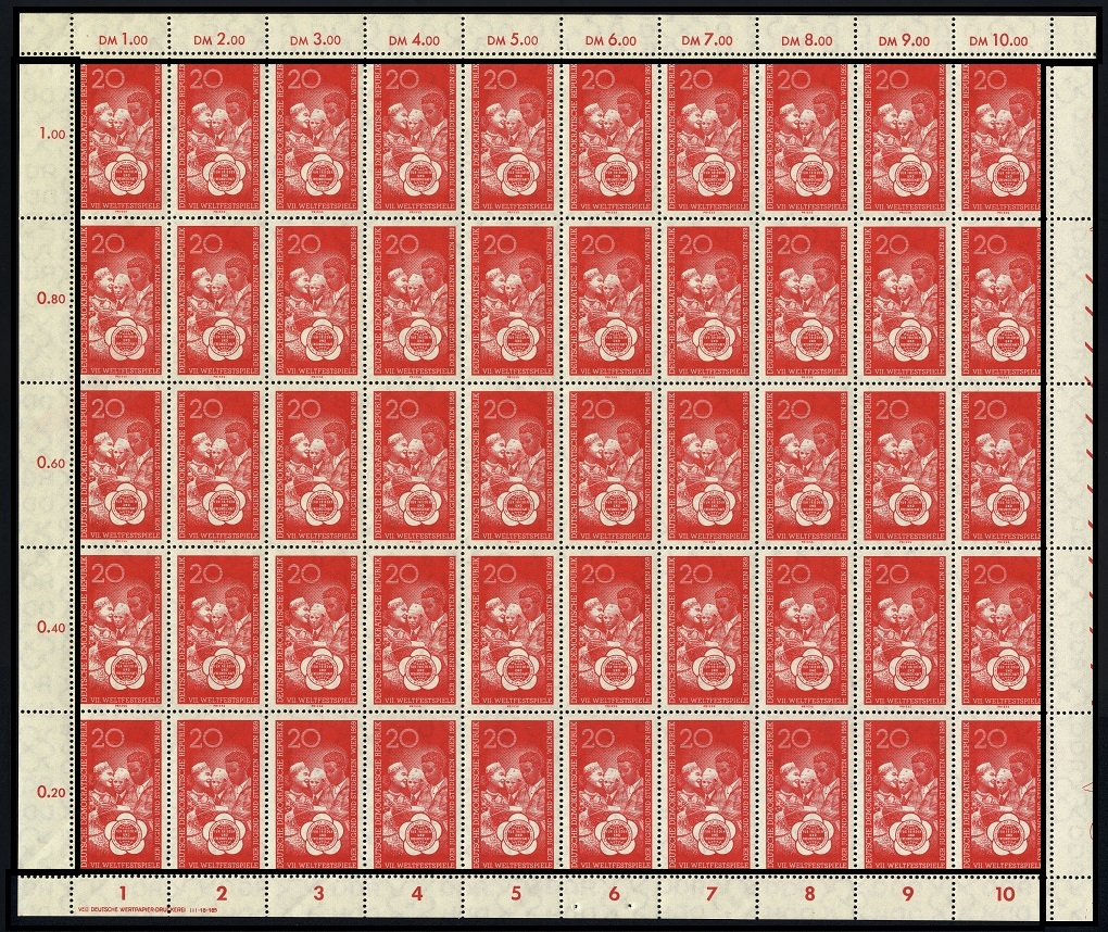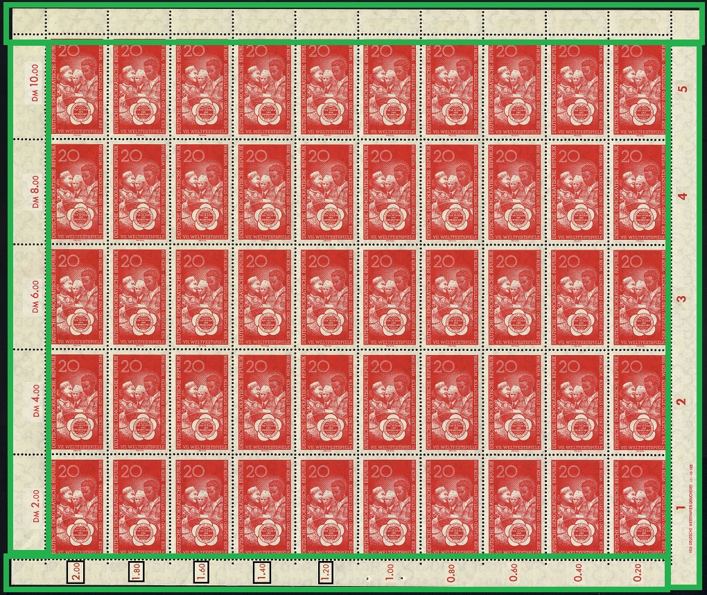 Grund dafür war, bzw. bin ich darauf aufmerksam geworden, weil uns ein Sammler ein fehlerhaftes Randstück mit falscher Summenzahl vorgelegt hat, der aus einem solchen falsch angeordneten Bogen stammt. Damit existieren derzeit 2 Druckvermerke ( von Herrn Wolf und den für 2500 € versteigerte von der Auktionsfirma Aix), sowie ein uns vorliegendes fehlerhaftes Randstück.
